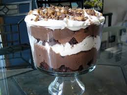3. In a glass punch bowl, layer in the following order: 1/2 of the brownie, crumbled; 1/2 of the pudding; 1 toffee bar, crushed; 1/2 of the whipped topping.